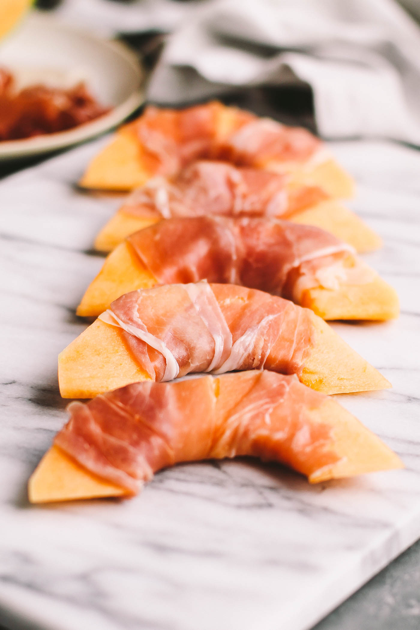 Ingredients: 1 small cantaloupe or honeydew melon 1 package of prosciutto Wash and cut the rind off of a cantaloupe or honeydew melon. Cut melon