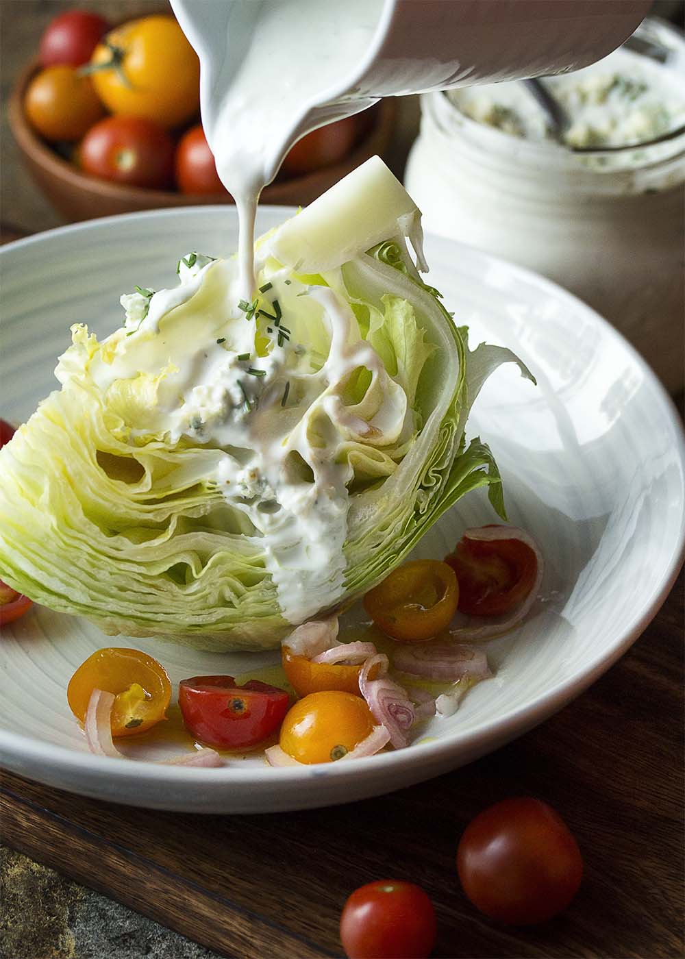 Ingredients: 1 Iceberg Wedge 1 onion, diced 1 tomato, diced 1/4 cup of Blue Cheese crumbles Hatch Chile Bacon Dip White Balsamic Vinegar Cut up