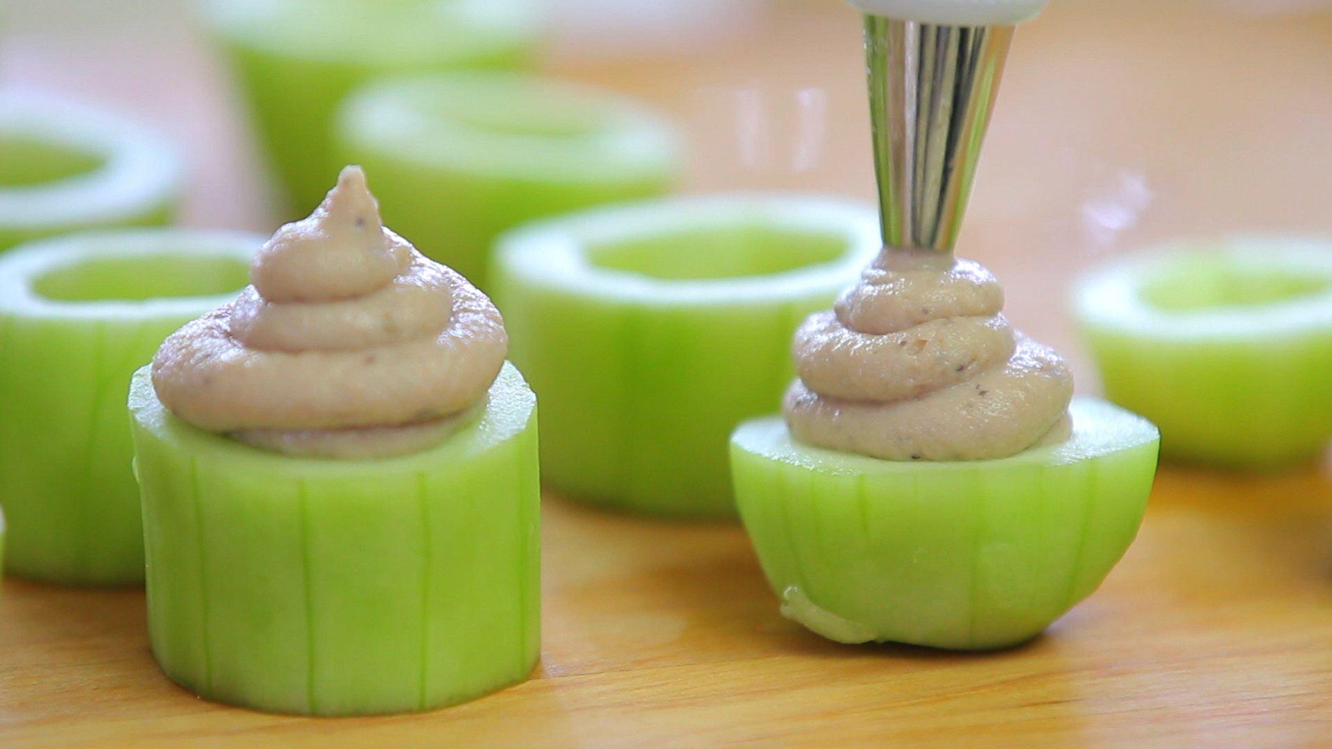 Ingredients: 2 – 3 large cucumbers 1 container of classic hummus Sriracha Horseradish Aioli Cut cucumbers in 1 inch increments. Scoop out the center of